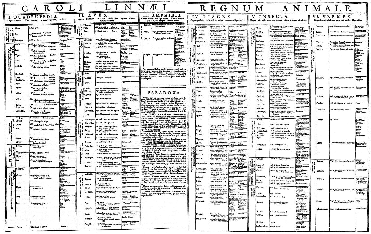 The value of Linnaeus’s system lies not in what it tells us about the life we already know, but in the durable conceptual framework it provides for integrating entirely new or unfamiliar forms of life as they are encountered. As a refresher, the basic taxonomic hierarchy of biological animal life he established consisted of five primary ranks: Regnum – Classis – Ordo – Genus – Species.